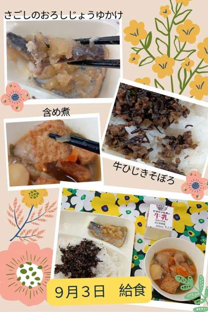 今日の給食(9月3日) 公開日 2025/09/03 更新日 2025/09/03 給食 今日は、個人的に大好物のメニューです。 焼き魚に大根おろしはとってもよく合います。さごしも普段あまり食べないので余計に嬉しい!(さごしはサワラの幼魚) またご飯にかけて頂くひじきそぼろは、ついつい白米を食べすぎてしまいます。 いいね(0)