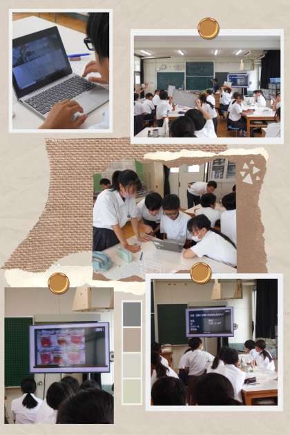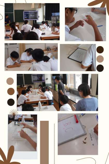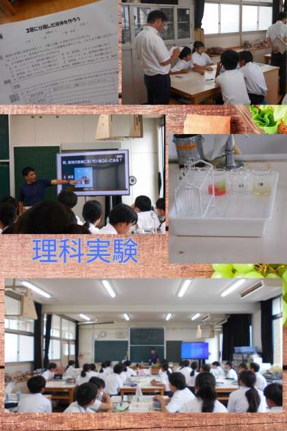 1年生の理科の授業では、なんだか楽しげな雰囲気で始まりました。ガラスの容器に入った3つの液体が机の上にあります。