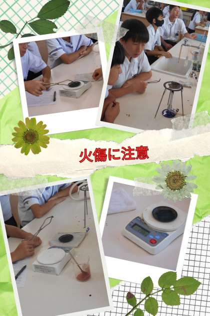 ここまでは順調。その後、ガスバーナーに苦戦か? 先生が巡回指導しながら着火。最初は10分間加熱します。加熱が終わったら、火を消し、濡れた雑巾の上で十分に冷やします。火傷の危険もあるので注意。繰り返し教員から指導がありました。十分に冷えたことを確認してから、質量を測ります。