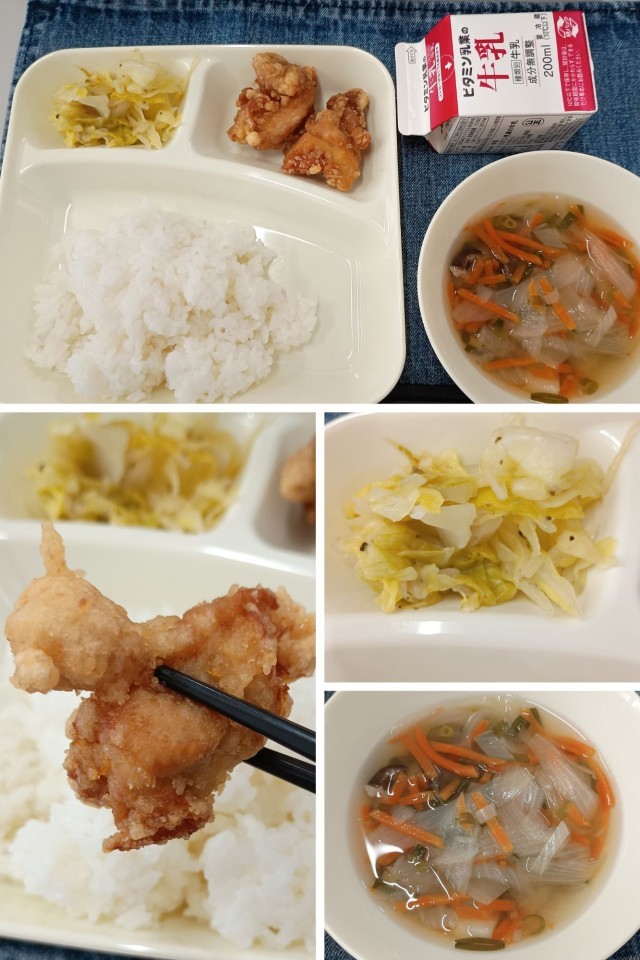 4月20日の給食 公開日 2026/04/20 更新日 2026/04/20 給食 ・鶏肉のたつたあげ・五目汁・キャベツの梅風味今日は鶏の竜田揚げでした。みんな「唐揚げだー!」とテンション上がっていました!教室では、揚げ衣のてんかすまで競い合って食べたとか。給食が学校生活の楽しみの一つになっていますね。 いいね(0)