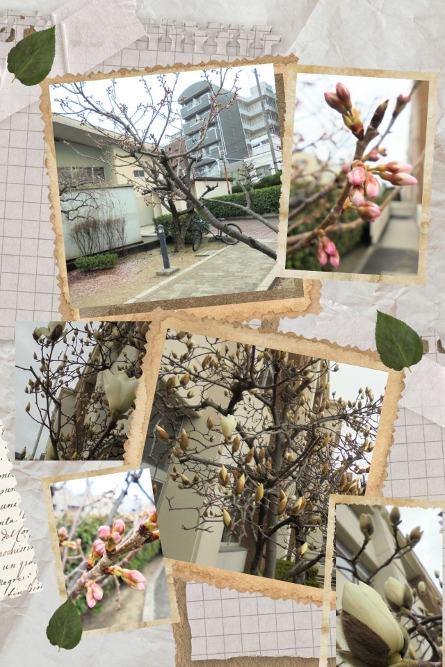 校庭の隅では、ハクモクレンが空に向かって真っ白な花びらを開き始めました。また、体育館前の桜も、よく見ると蕾の先がピンク色に色づいています。