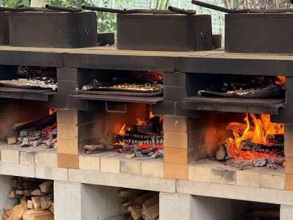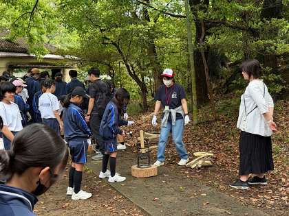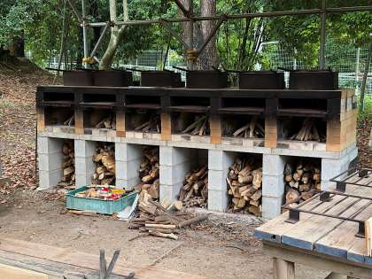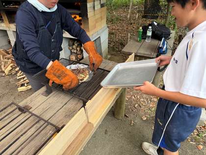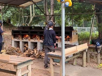 現在、薪割り体験の最終ローテに入りましたが、その裏では施設の方々が、みんなが割った薪を窯にくべてくれています。
