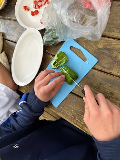 生地をこねつつ、トッピング調理の段階に移りました。ウインナーとピーマンを切ってトッピング作りを並行しています!