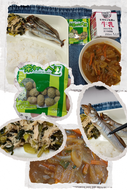 焼きししゃも、和風カレー汁、ささみとこまつなのいためもの、まっ茶大豆