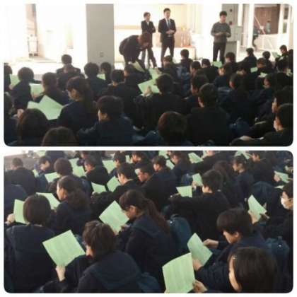 新2年生の先生方からクラス分けのプリントが配られ、静かに自分のクラスを確認し、新しいクラスに並び変わりました。