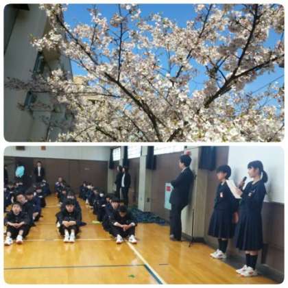 4月8日(月)、体育館横の桜が満開の中、生徒会主催の対面式が始業式に先立ち体育館で行われました。