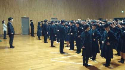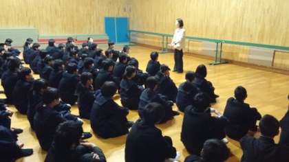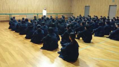 学級委員長の先導で8時15分には1組が武道場に入り、西川先生の指揮で整列、学年集会が始まりました。この時間で遅れて集会に参加する生徒はなく、一人ひとりの行動からも、子どもたちの頑張ろうという意欲が伝わってきました。