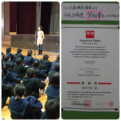 次に、英語科の落合先生から英検の第1回の一次試験について連絡がありました。昨年度も本校は公益財団法人日本英語検定協会から奨励賞をいただきましたが、今年度も多くの人のチャレンジを期待しています。