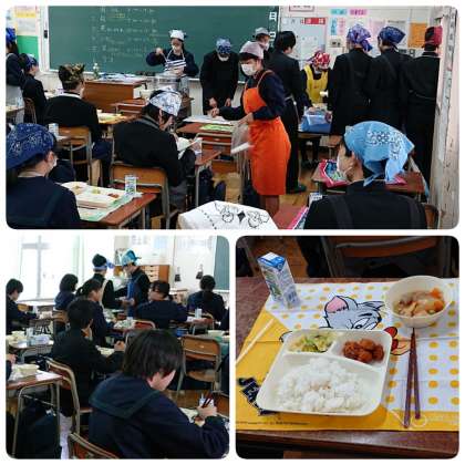 今日の給食のメニューは、まぐろのオーロラ煮、じゃがいもと野菜の含め煮、キャベツの梅風味とご飯です。