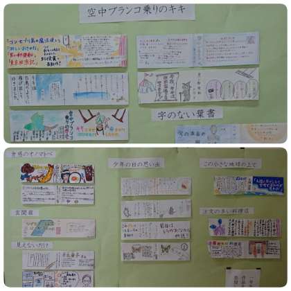 2年生の廊下には2年生が作成した「本の帯」が掲示され、図書館前の廊下には新しい本の紹介が掲示されています。