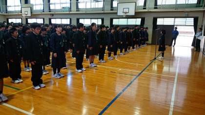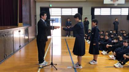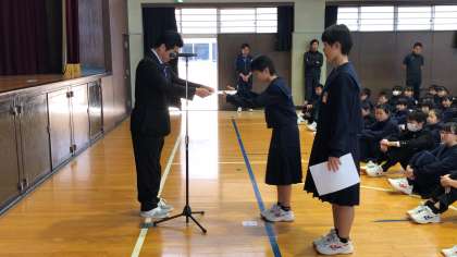 始めに、4月29日(月)に行われた第10回フォレストマウンテンカップで敢闘賞を受賞した女子バスケットボール部3年の畑中香凛さん、5月3日(金)に行われたKOUBUNN CUP2019バスケットボール選手権で優秀選手賞を受賞した女子バスケットボール部2年の大田来巳加さんに学校長から表彰状が授与されました。