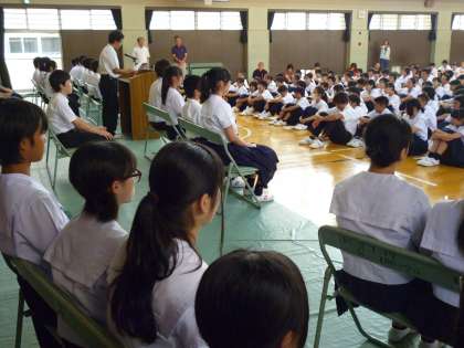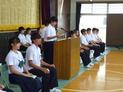 当選した立候補者による演説が体育館で行われ、新たに生徒会のメンバーとなった抱負を述べていました。
