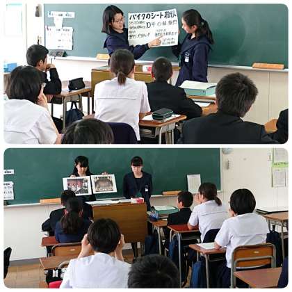 これまで、2〜3人のグループで家族や近所の方、知り合いの方などから、仕事についてのインタビューさせていただき、その内容をまとめ、フリップを使って発表したり、クイズを取り入れたり、工夫を凝らして発表していました。