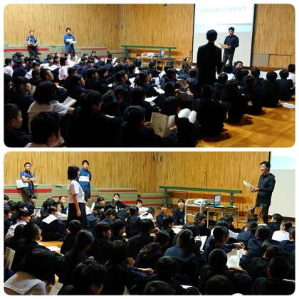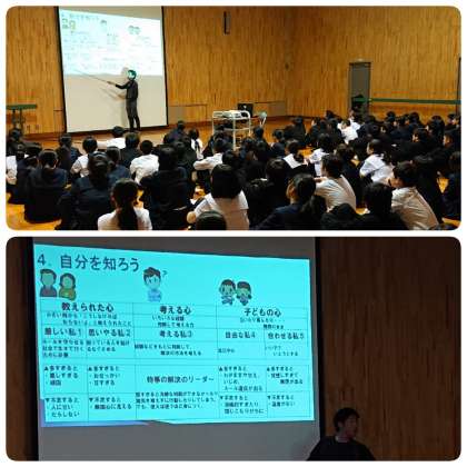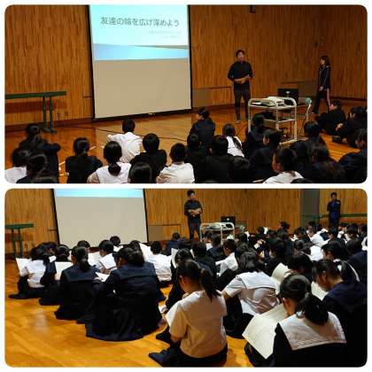 5月10日(金)5時間目、1年生は武道場で「友だちとの輪を広げ、深めよう」をテーマに、パワーポイントを使いながら人権学習に取り組みました。