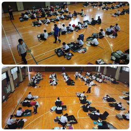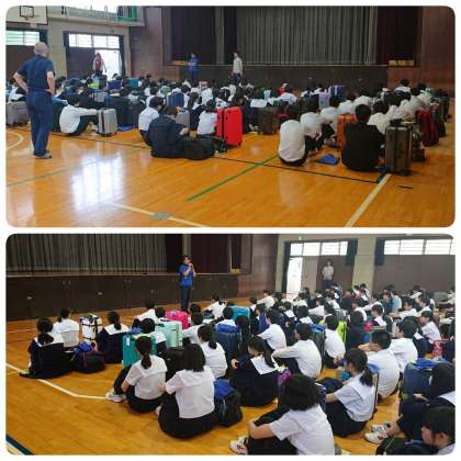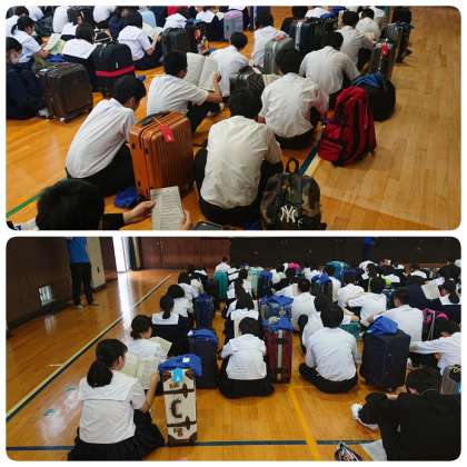 5月15日(水)5・6時間目、3年生は耳鼻科検診を終えたのち、修学旅行に持っていく旅行用バッグを持って体育館に集合しました。
