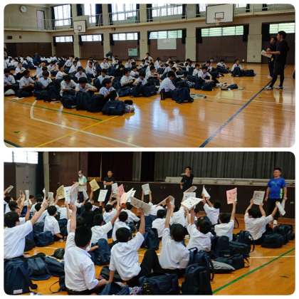 5月22日(水)3・4時間目、1年生は明日から始まる一泊移住に向けての事前指導です。教室での担任の先生方からの連絡確認の後、体育館に集まり男女別に一泊移住に持っていく荷物の確認を行いました。
