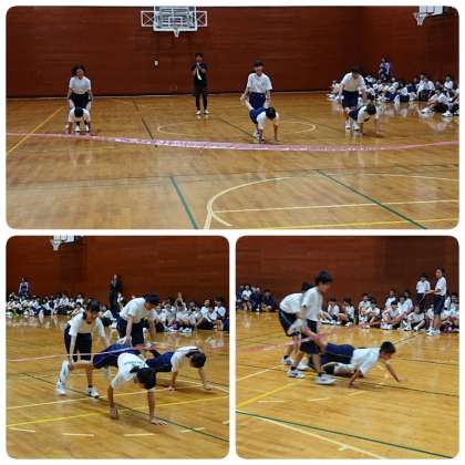 手押し車で競う競泳、トイレットペーパーの上を走る平均台、ピンポン玉を吹いてリレーする卓球です。