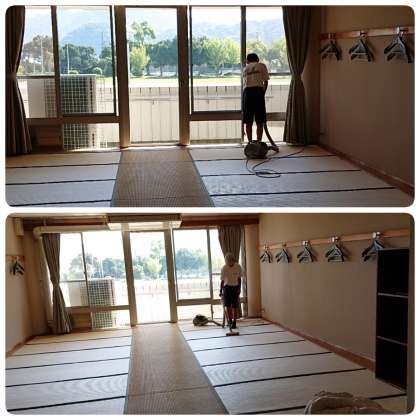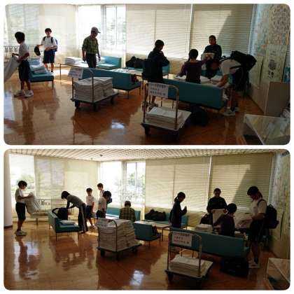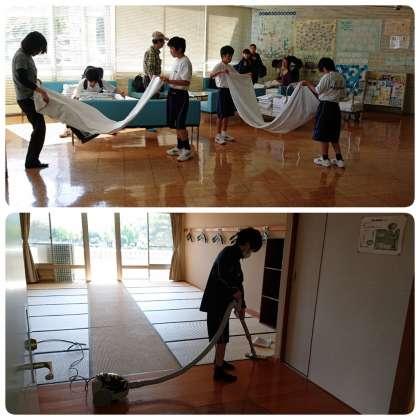 シーツ係は自分の班のシーツをまとめ、返却です。正しく畳めていない班は先生の指示でやり直しです。美化係は、掃除機で部屋の掃除です。他の班員は荷物をカバンに片付け、体育館に集合です。