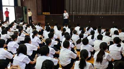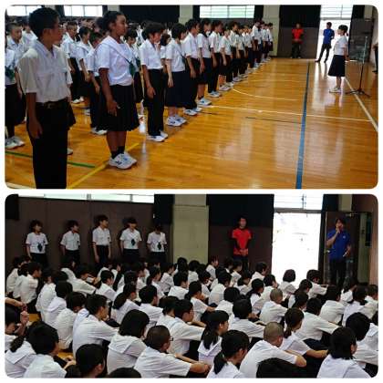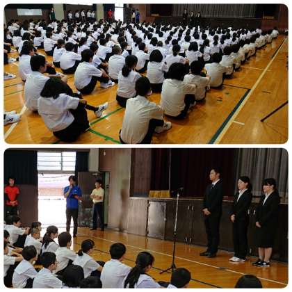 始めに、教務主任の川西先生より、今日から本校で教育実習を行う本校卒業生の岡田先生(社会科)、乾先生(社会科)、新納先生(家庭科)、すでに木曜日から学校実習を行っている教職大学院の川尻先生(音楽科)の紹介があり、それぞれ自己紹介を行いました。