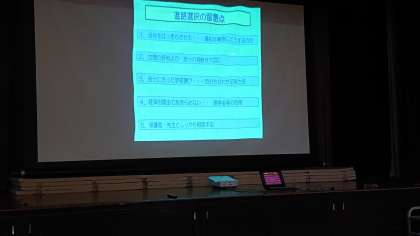 進路指導主事の西先生から、進路決定に向けての1年間の流れ、私立・公立の受験の制度、進路決定に向けての心構えなど、パワーポイントを使って説明がありました。