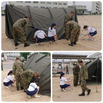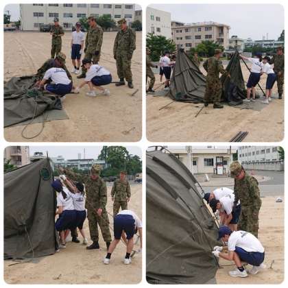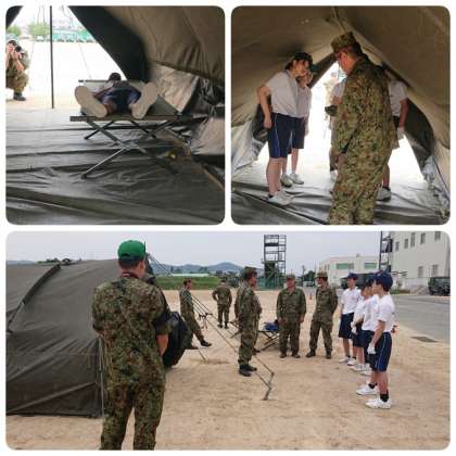 第36普通科連隊の皆さんの指導を受けながら、6人で協力してテントを設営しました。完成後は簡易ベッドで一息です。