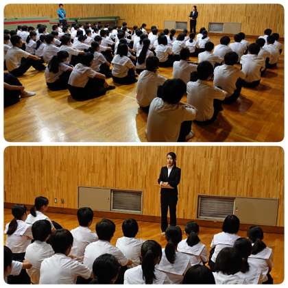 続いて、教育実習に取り組んでいる新納先生からの話です。自身の経験から3年生へ進路決定にむけてのアドバイスがありました。