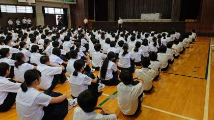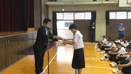 始めに、6月9日(日)に行われた第12回アンビシャスカップで優秀選手賞を受賞した女子バスケットボール部2年の佐々木楓さんに学校長から表彰状とトロフィーが授与されました。