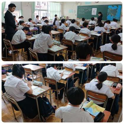 3年1組の社会科の授業では、チャレンジテストに向け、実習の先生方と一緒にグループ学習で過去問に取り組んでいました。