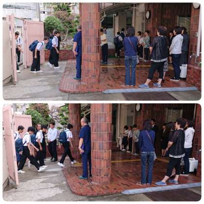 教育実習に取り組む3名の大学生、学校実習に取り組む2名の大学院生も加わり、たくさんの大人が、登校する子どもたちに、温かく「おはようございます」と声をかけました。子どもたちも、しっかりと挨拶を返してくれます。