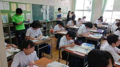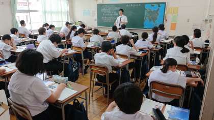 写真は、1時間目、1年1組の社会科の研究授業の様子です。