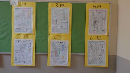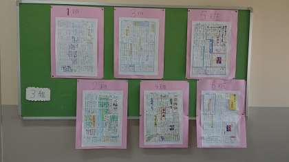 各クラス各班で取り組んできた1年一泊移住壁新聞が完成し、階段の踊り場と手洗い場横の掲示板に掲示されました。