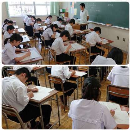8時40分に解答用紙・テスト問題が配布され、8時45分から1時間目のテストが始まりました。写真は1年生の様子です。中間テストを経験し、少し慣れてきたでしょうか。