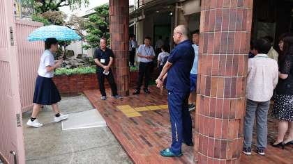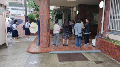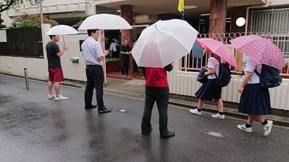 雨の中にもかかわらず、登校する子どもたちに、温かく「おはようございます」と声をかけてくださいました。子どもたちも、しっかりと挨拶を返しています。