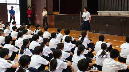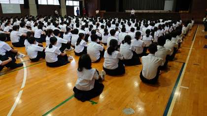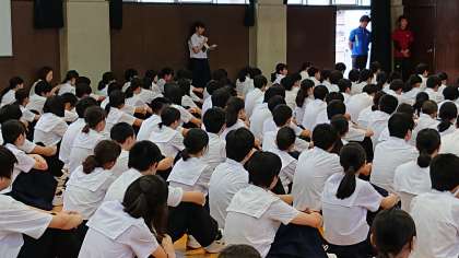 次に、文化委員会の代表から今年の文化祭のテーマ『青春(アオハル)〜青春の最高の1ページを〜』にふさわしいシンボルマークの投票について説明がありました。投票は本日、終学活において各教室で行われます。各クラスで選ばれた候補9作品は「令和元年文化祭 シンボルマーク投票用紙」からご覧ください。