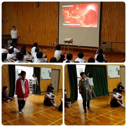 始めに、江野先生から1年生の時の性教育の学習を振り返りながら、体や心の変化の男女の違い、ご両親から命を授かり今ここにいる奇跡、妊娠と出産などについて、DVDを観ながら話がありました。
