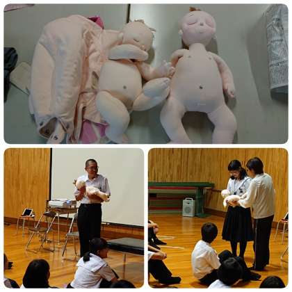 続いて、妊婦体験スーツから出てきた赤ちゃん人形(3kg)の抱っこを体験しました。首の座らない赤ちゃんを抱く大変さも実感しました。