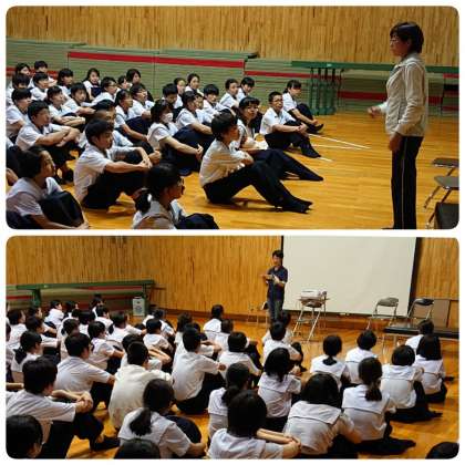 最後に、1年の冬休み、保護者の皆様にご協力いただいた調べ学習の回答から、「お子様が生まれた時にどんなことを願いましたか」「中学生になった今、どんな人に成長してほしいと願っていますか」について、山口先生から紹介しました。子どもたちは、真剣なまなざしで山口先生の朗読を聴いていました。