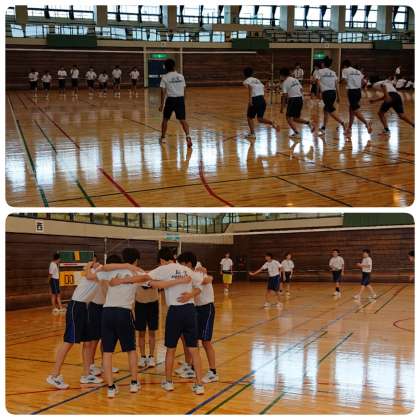 試合前にコートで練習、対戦相手と挨拶、円陣を組んで気合いを入れて、いよいよ試合開始です。