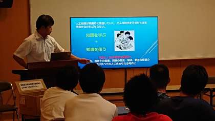講師は教育委員会の研修を受けてきた川西先生です。文部科学省が目指す今後求められる「学力」「知識」の在り方、「深い学び」の実現に向けた授業の在り方などについて全教員で研修を深めました。