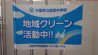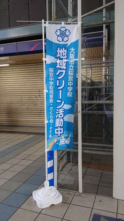 今日の地域クリーン活動で、桜宮中学校同窓会・さくら会・PTA合同で作っていただいた「地域クリーン活動」の横断幕と幟のお披露目です。