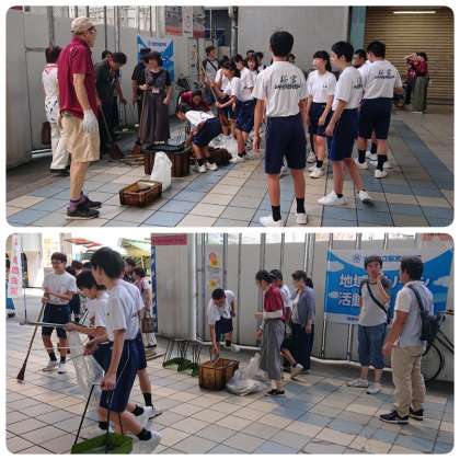 朝からの厳しい暑さにも負けず、50名ほどの生徒、PTA 役員・実行委員の皆さん、学校元気アップの皆さんや先生方、地域青少年指導員の皆さんが協力して、JR ・京阪京橋駅周辺の清掃活動を行いました。