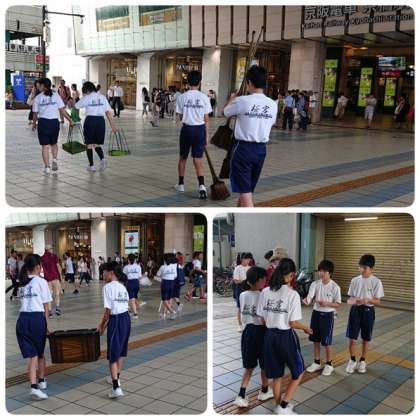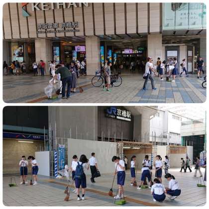 「地域クリーン活動」の横断幕と幟のもとで清掃活動を実施することで、地域やPTAの皆さんと一緒に取り組むこの伝統的なボランティア清掃を京橋駅を利用する皆さんに知っていただいたと思います。