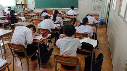 1年3組の教室を自主学習の場として開放し、子どもたちは自分が持ってきた夏休みの宿題や問題集に静かに取り組んでいました。