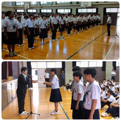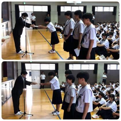 始業式に先立ち 夏休み中の部活動等の表彰状伝達です。