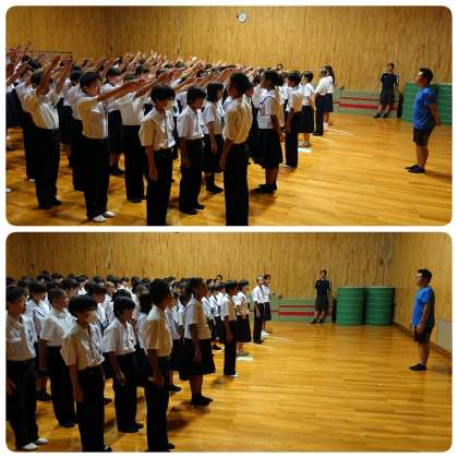 8時15分に委員長を先頭に教室から武道場に移動、8時20分には角田先生の指揮で整列を完了しました。