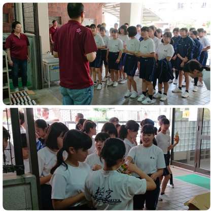 清掃用具を学校に持ち帰り、最後に体育館前に集合して、PTA環境美化委員の代表の方からお礼の挨拶があり、参加者全員にペットボトルのお茶が配られました。