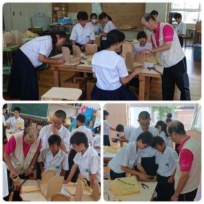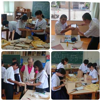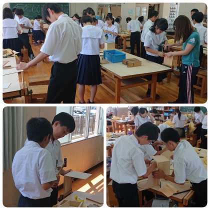 グループで協力しながら、金槌やカンナ、木工用ボンドなどを使い、慣れない手つきで一生懸命ものづくりに取り組んでいました。完成品は、文化祭で展示される予定です。