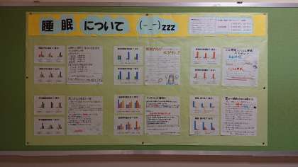 7月に生徒保健委員会で全校生徒を対象に実施した「睡眠に関するアンケート」の結果を3年保健委員がまとめ、1階から2回に上がる階段踊り場に掲示してくれました。