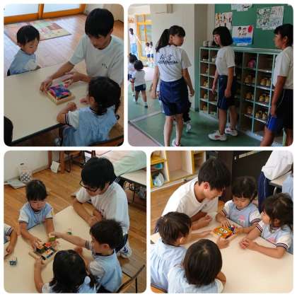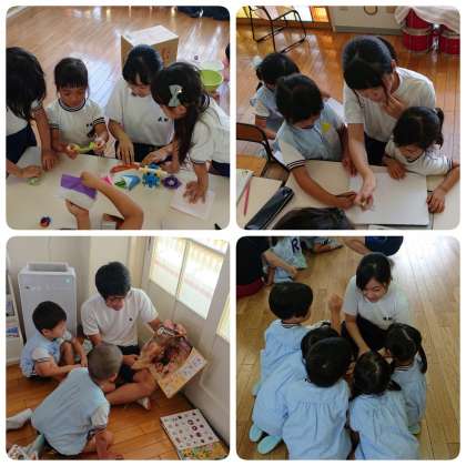 中学生手作りのパズルで遊んだり、折り紙をしたり、お絵かきをしたり、絵本を読んであげたり、中学生と園児さんが一緒になって楽しく遊んでいました。