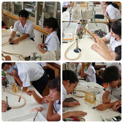 今日は理科室で「化学変化・物質どうしが結びつく変化」の実験です。